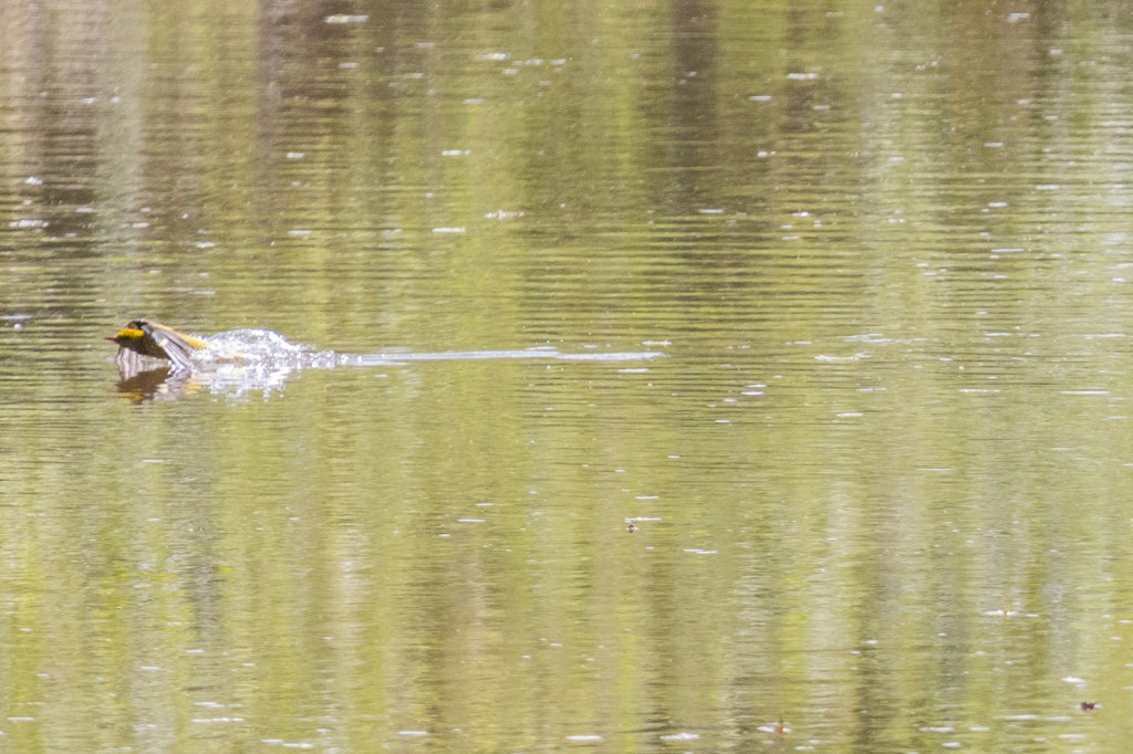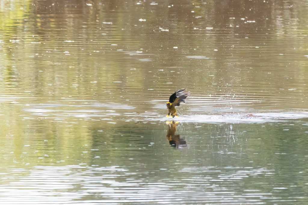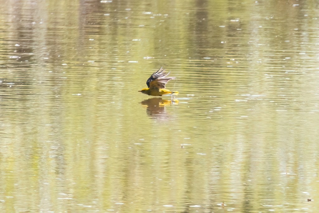 Von einer Fussgängerbrücke in Meisenheim aus konnte ich beobachten wie ein Pirol immer wieder ins Wasser stieß. Zuerst dachte ich sie würden fischen oder nach Insekten knapp über der Wasseroberfläche jagen. Später erklärte mir jemand, dass dieses Verhalten „Flugbaden“ genannt wird.